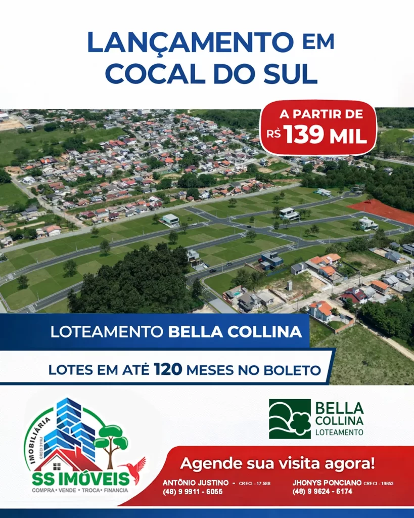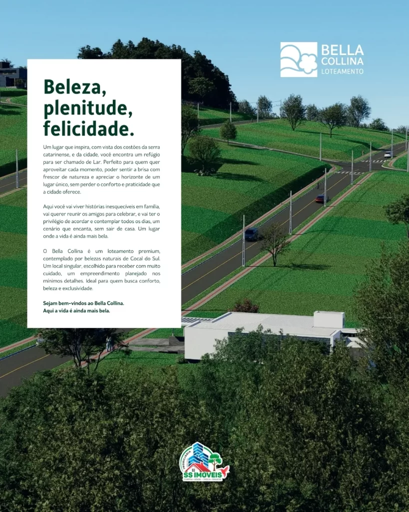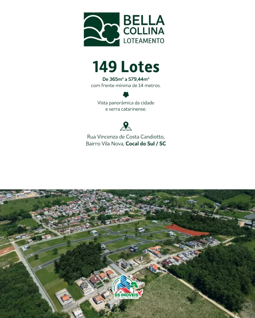 O Loteamento Bella Collina nasce em uma das regiões mais altas da cidade, oferecendo vista aberta e panorâmica para Cocal do Sul e para a serra catarinense. Um lugar pensado para unir tranquilidade, natureza, infraestrutura completa e praticidade no dia a dia.