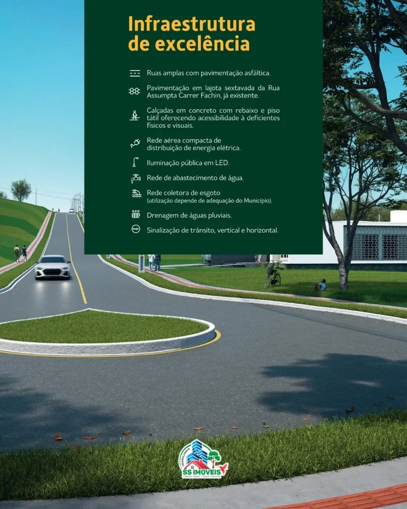 - Calçadas em concreto com rebaixo e piso tátil, garantindo acessibilidade